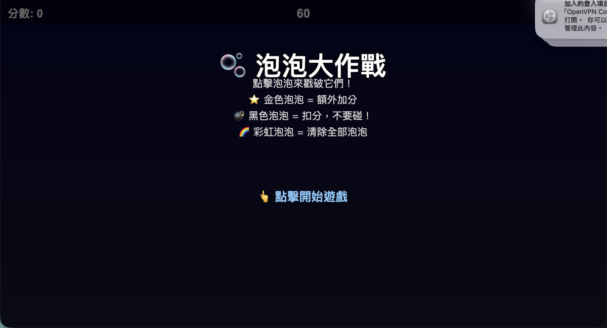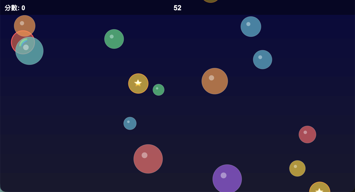 Colorful bubbles float up from the bottom of the screen. Tap or click to pop them and score points before time runs out!